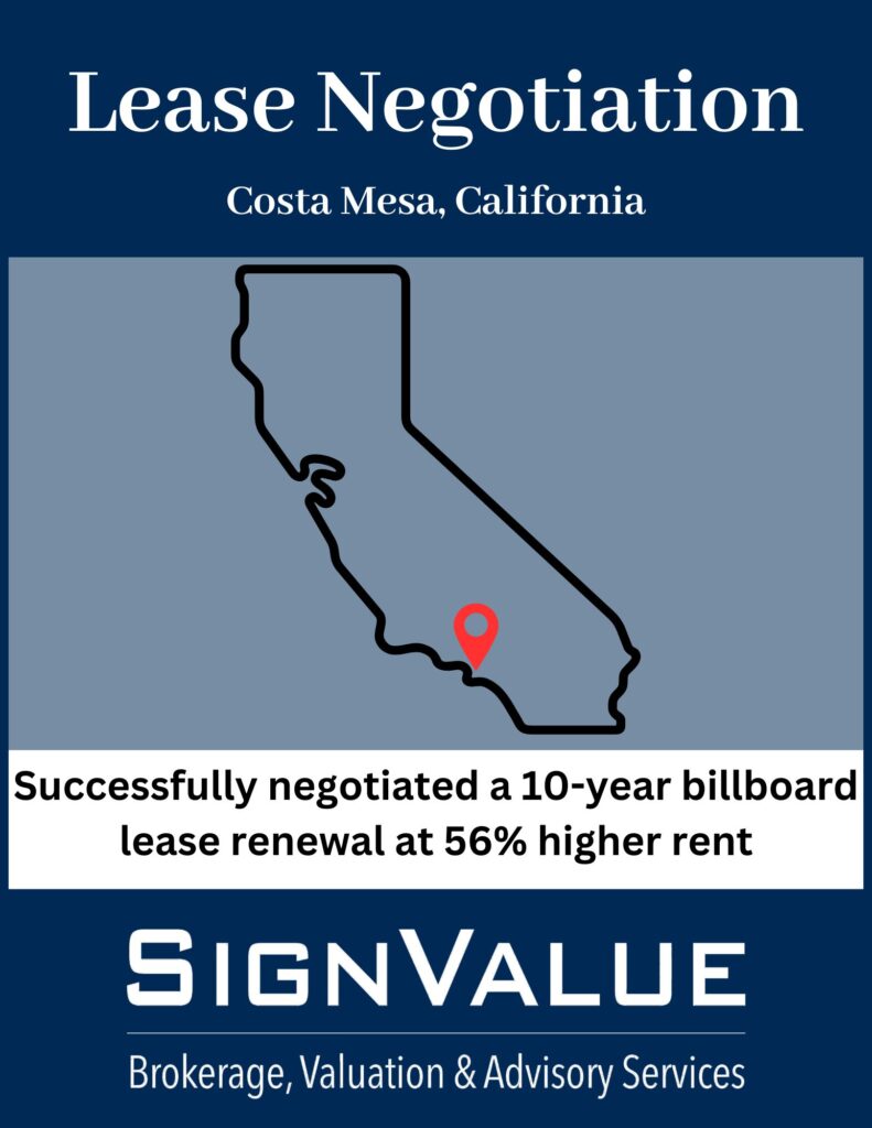 SignValue successfully renegotiated a 10-year lease renewal for our client along the Costa Mesa Freeway (CA-55) that included a 56% increase in base rent and a 20% bump in percentage rent.