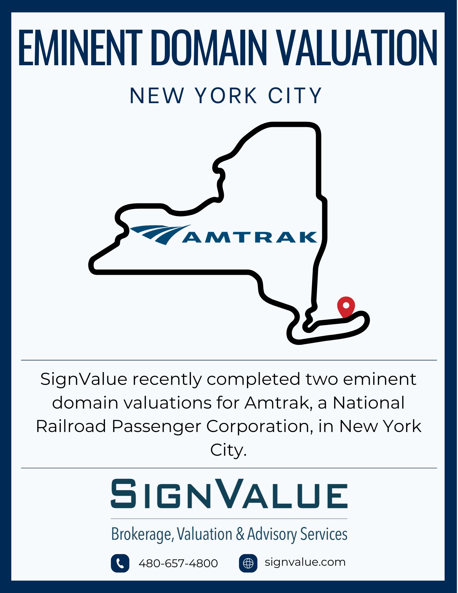 SignValue recently completed two eminent domain valuations for Amtrak in New York City. Amtrak is a National Railroad Passenger Corporation, and our valuations will assist them and their legal counsel with negotiations.
