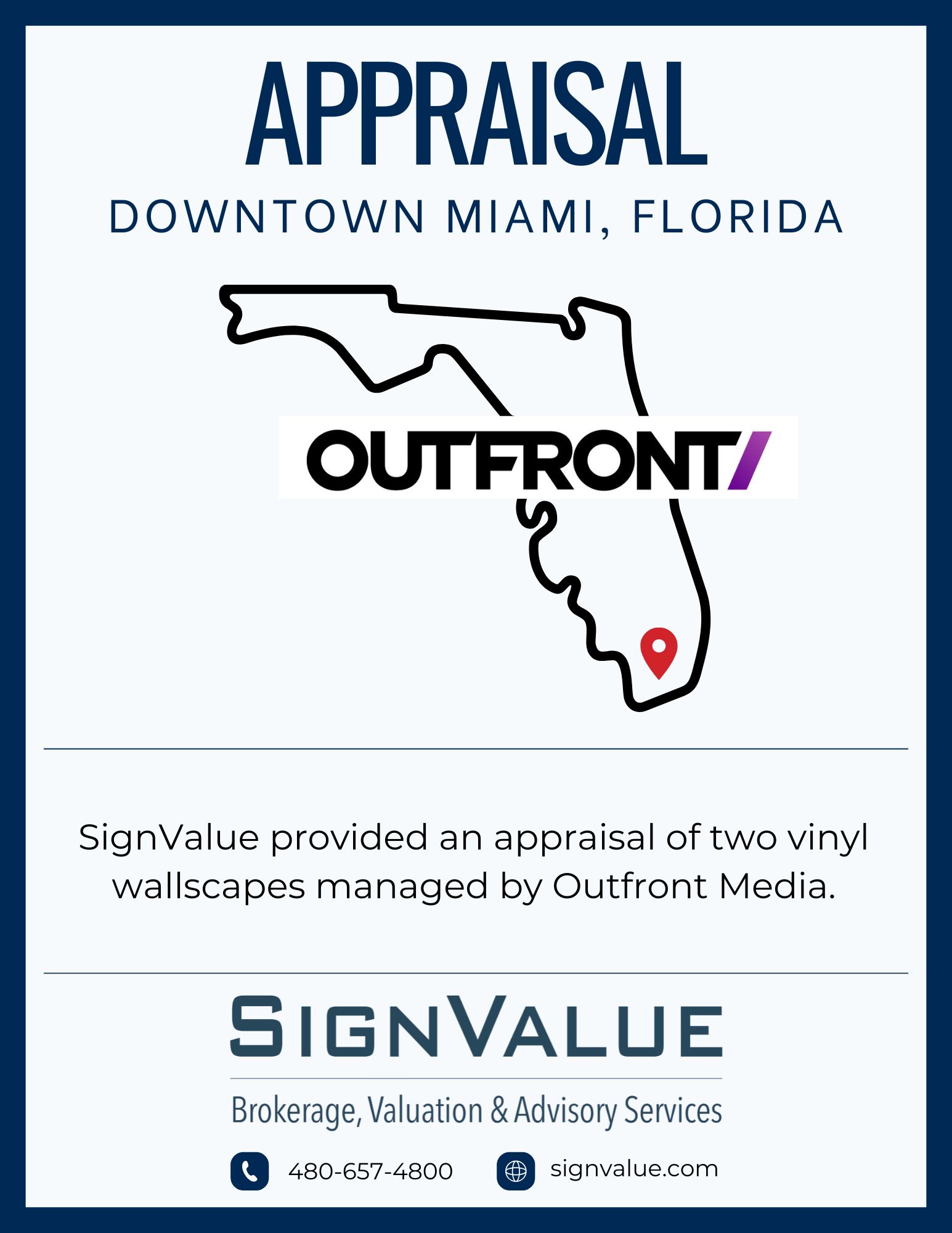 SignValue has completed the latest addition to our portfolio of OOH asset appraisals in Downtown Miami. SignValue provided an appraisal of two prominent vinyl wallscapes managed by Outfront Media, a top ranked out-of-home advertising company. The dynamic atmosphere of downtown Miami provided a unique backdrop for our research, analysis and appraisal.