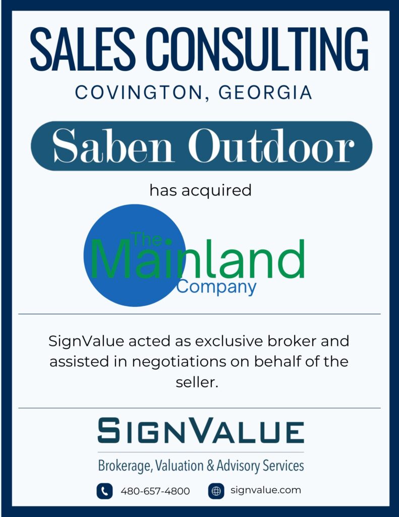 SignValue is proud to have provided sale consulting services involving four billboard displays located in Covington, GA. Broker Brian Shuford facilitated the deal, ensuring a smooth transaction from Mainland Company to Saben Outdoor.